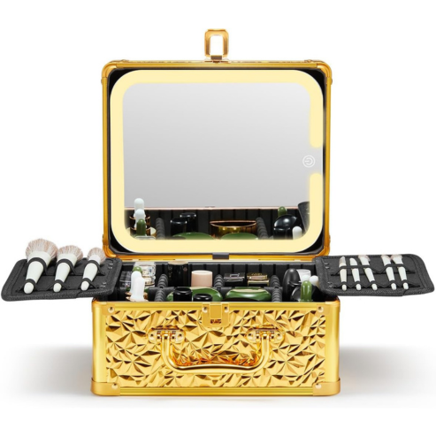 Lovely gold luxe cosmetic case with detachable mirror that is touch screen technology to adjust lighting to desired setting and dimmable. Lightweight great for travel and very functional. Perfect size for on the go or for vanity top to store your daily cosmetics. Great strong durable quality and craftsmanship making this a fantastic value for your money