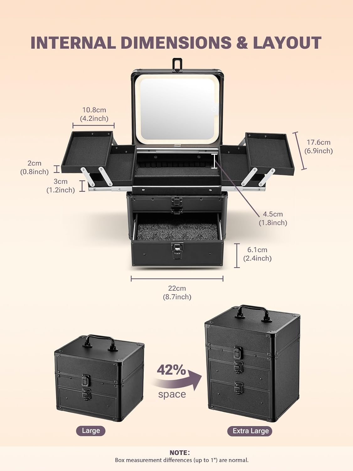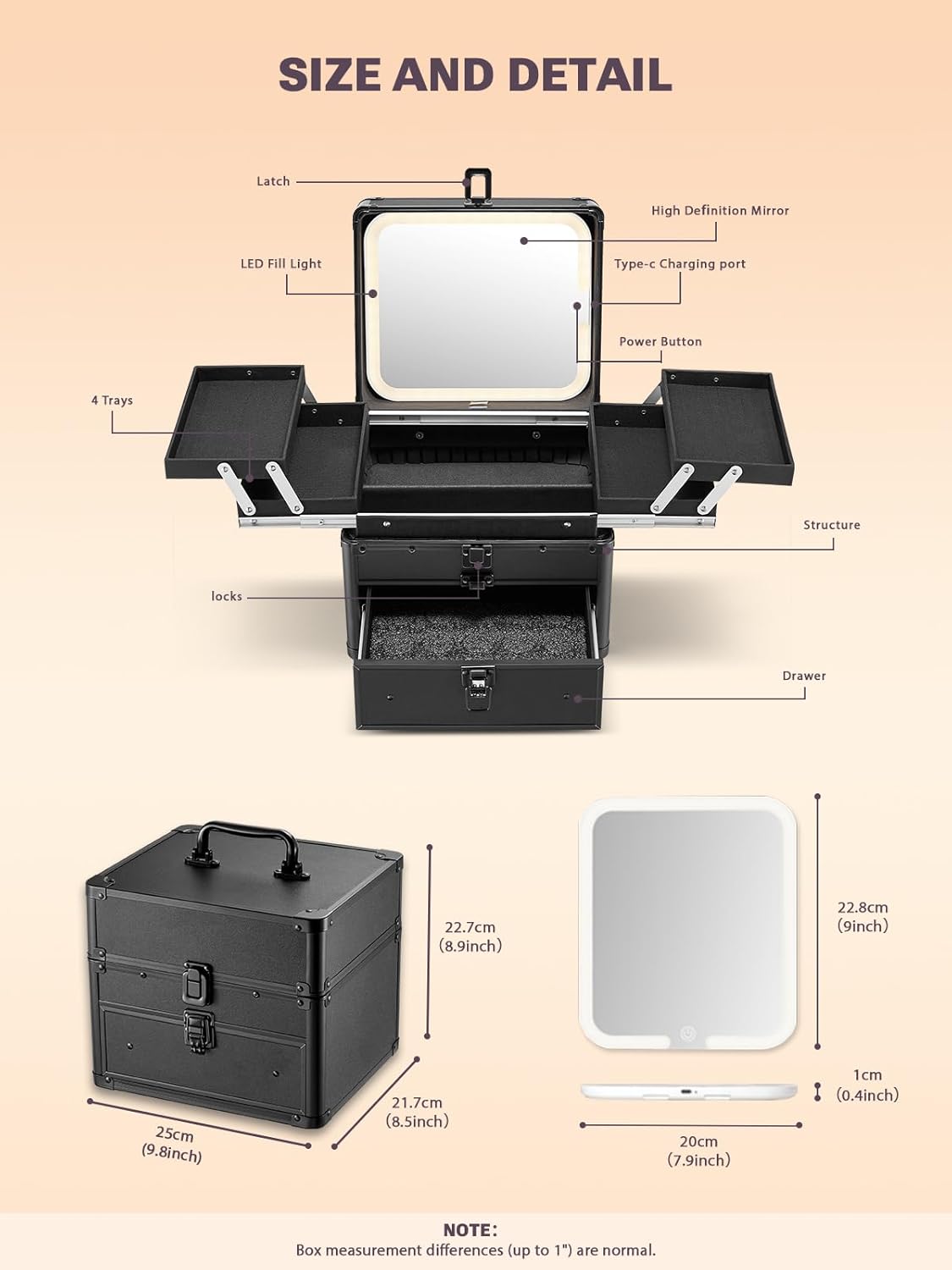 Multifunctional Makeup Organizer: This makeup case organizer features 4 slide-out cantilever trays, and a detachable magnetic mirror and 1 drawer for customizable storage. And 5 different colors are available, choose the favorite for yourself or your loved one