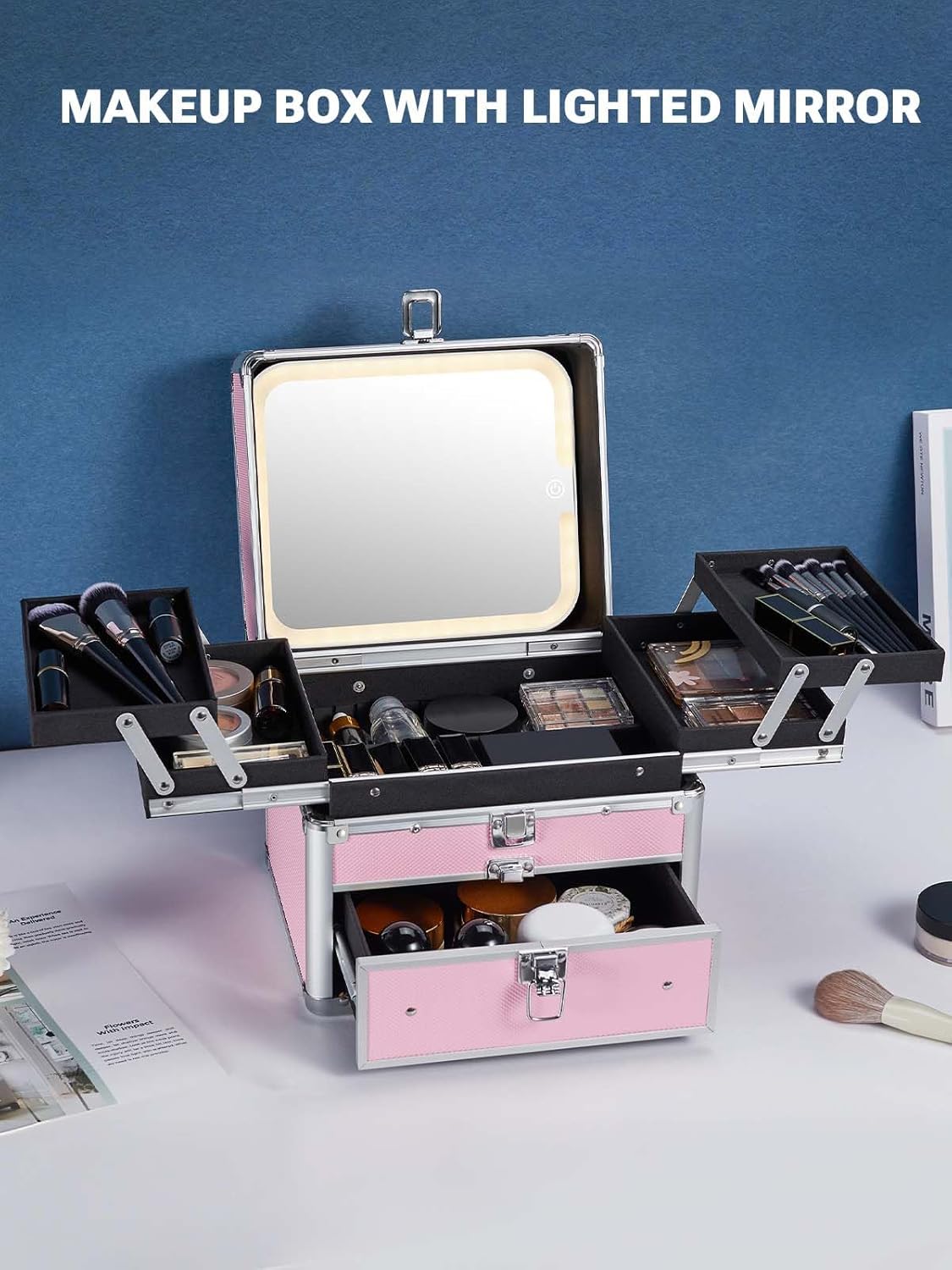Qislee Makeup Box with Drawer and Four Trays, A Detachable Lighted Mirror, Waterproof Travel Train Case, Cosmetic Organizer and Makeup Suitcase with Magnetic LED Mirror(ICY Pink)