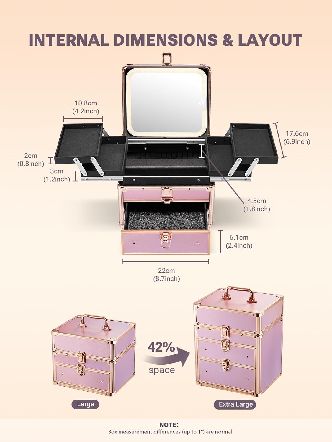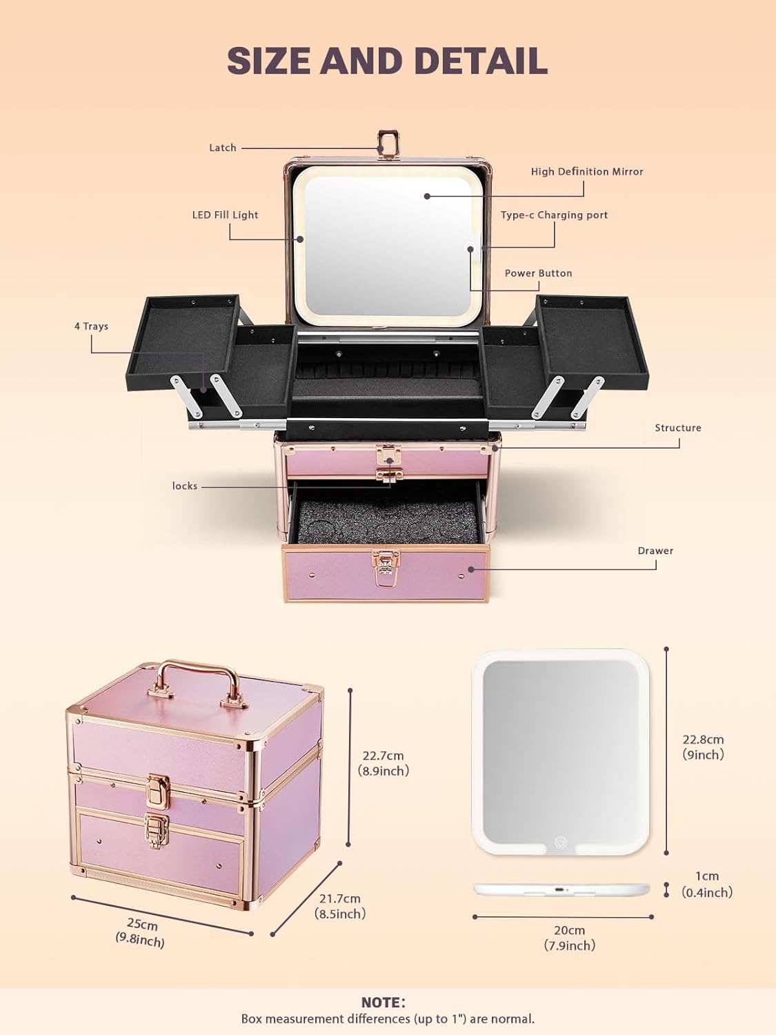 Multifunctional Makeup Organizer: This makeup case organizer features 4 slide-out cantilever trays, and a detachable magnetic mirror and 1 drawer for customizable storage. And 5 different colors are available, choose the favorite for yourself or your loved one
