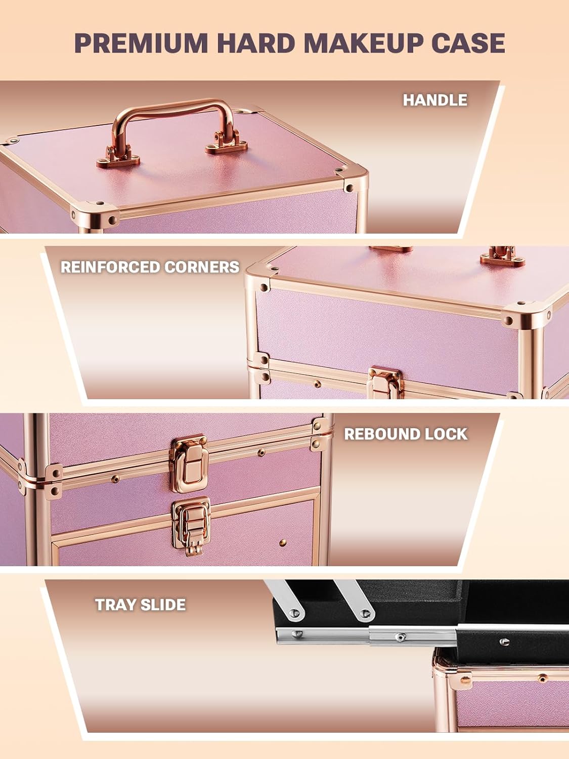 Professional Hard Makeup Travel Case: Measuring 9.6x8.3x8.1 inches, this make up box organizer is ideal for all makeup artists. Made with cardboard and metal-reinforced corners for durability, it features a latch with a quick rebound lock