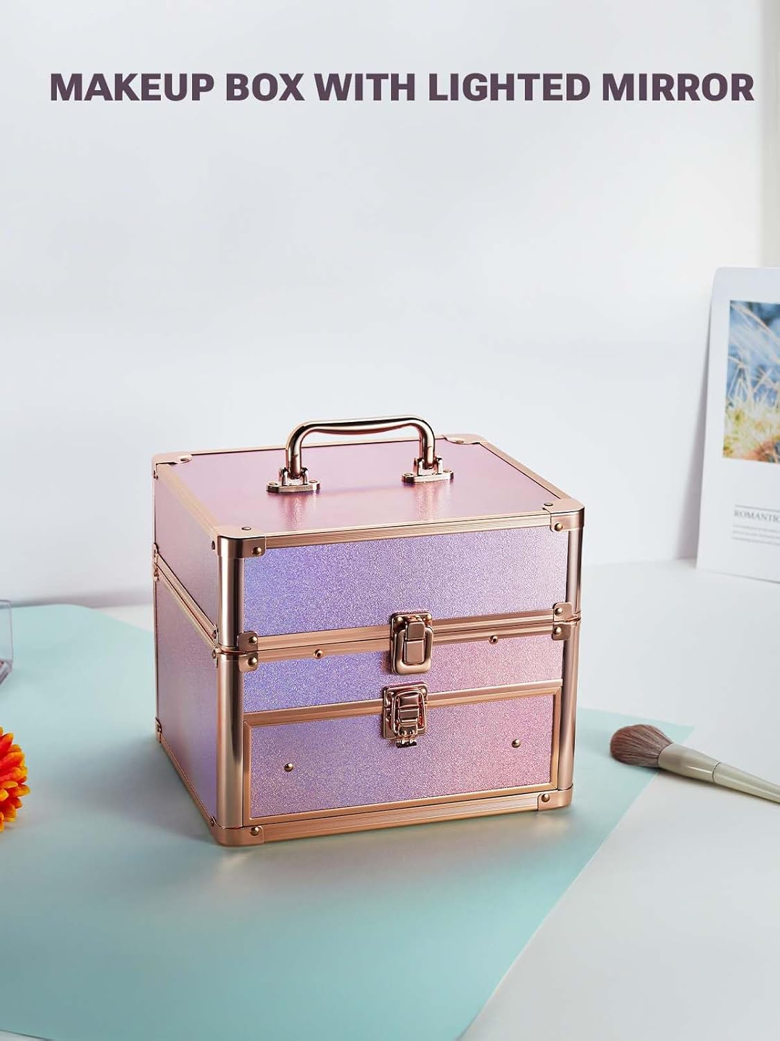 Qislee Makeup Box with Drawer and Four Trays, A Detachable Lighted Mirror, Waterproof Travel Train Case, Cosmetic Organizer and Makeup Suitcase with Magnetic LED Mirror(Sparkling Gradient Pink)